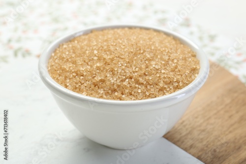 Brown sugar in bowl on table, closeup