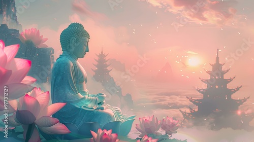 buddha, lotus, temple, illustration, spiritual, calmness, meditation, serene, sacred, religious, celebration
