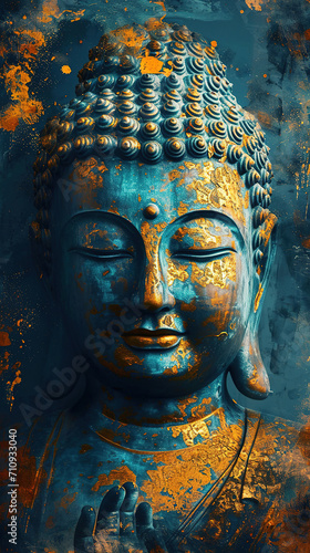 Buddha statue in gold, blue, white colors with patina. Vertical Illustration.