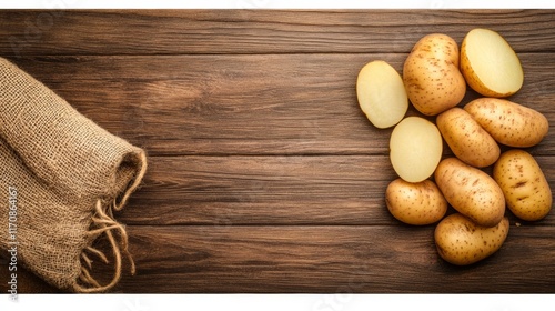 Bunch of potatoes are on a wooden table with a burlap bag. The bag is tied with a string