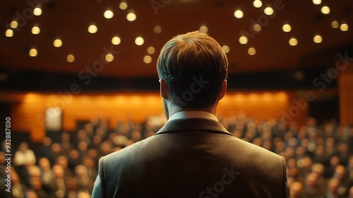 Business and entrepreneurship symposium Speaker giving a talk at business meeting Audience in conference hall Rear view of unrecognized participant in audience : Generative AI