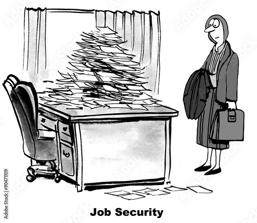 Business cartoon showing businesswoman looking at her desk with piles and piles of papers. She has 'job security'.