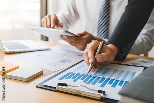 Business Collaboration with Tablet, Bar Graph, and Documents in Office Setting