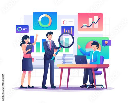 vector, illustration, business, businessman, datum, analysis, statistic, work, graph, chart, report, dashboard, concept, magnifier, desk, meeting, brainstorming, arrow, growth, marketing, finance, flat, icon, design, investment, money, management, strategy, computer, laptop, office, graphic, communication, teamwork, man, woman, people, character, cartoon, infographic, idea, digital, modern, corporate, target, plan, web