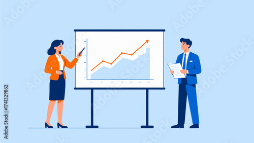 woman, man, suit, blazer, skirt, high heel, attaching, clipboard, pen, whiteboard, chart, graph, bar chart, arrow, presentation, racked, paper, business attire, blue background, illustration, professional, meeting