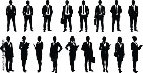 Business professional silhouettes, men and women in formal attire, standing poses, office workers, teamwork concept, black vector, isolated illustration