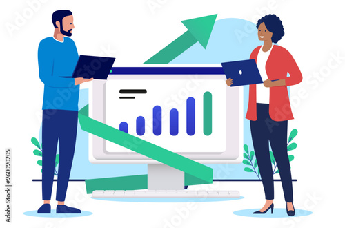 Business success and growth - Two people standing in front of rising chart and graph on computer screen. Flat design vector illustration on white background