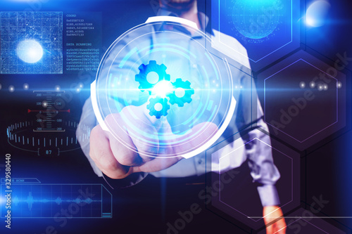 Business, Technology, Internet and network concept. Young businessman working on a virtual screen of the future and sees the inscription:
