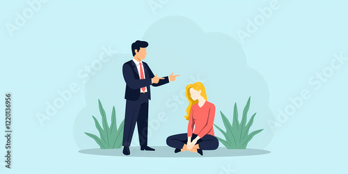 businessman points a finger at a seated woman indicating instruction or confrontation