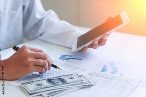 Businessman with cash dollars - business concept,tablet and finance,investment,save.