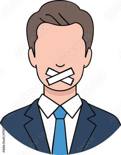 businessman, muted, mouth, tape, silence, censoring, communication, business, corporate, suit, attaching, man, profile, cartoon, illustration, vector, graphic, design, office, employee, leadership, professional, quiet, restricted, expression, speechless, protest, social, media, politic, image, icon, symbol, editable, digital