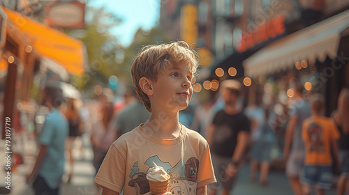 urban, summer, street, people, boy, ice cream, sunlight, shadow, city life, enjoyment, warm, dynamic, casual attire, bustling, crowd, public, leisure, sunny day, vibrant, atmosphere, lifestyle, youth, indulgence, treat, city landscape, tied-up, pedestrian, community, everyday, relaxation, candid, moment, childhood, refreshment, downtown, paseo, carefree, lively, face, smile, city, person, children, smiling