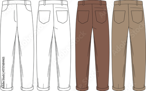 Cad drawing flat vector illustration, back view folded hem pants, technical fashion sketch, trousers template, casual wear, outlined and colored version