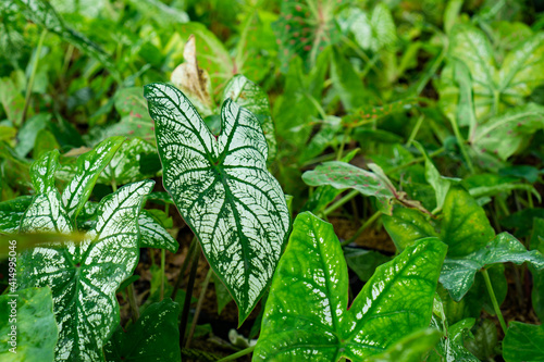 Caladium white Christmas plants. White and green caladium leaf on a garden