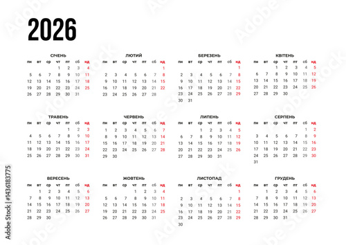 2026, calendar, template, ukrainian, new, year, language, planner, schedule, organisation, date, month, day, office, planning, week, date, month, jan, february, march, april, may, june, july, august, september, october, november, december, vector, design, illustration, paper, concept, note, set, time, diary, organiser, business, layout, monthly, day