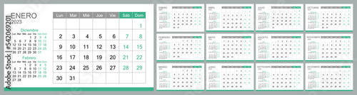 calendar, spanish, 2023, monthly, template, planner, year, date, day, new, vector, month, illustration, week, modern, design, schedule, event, concept, signs, white, deadline, monday, layout, time, set, december, print, business, daily, november, plan, reminder, season, august, note, agenda, jan, background, diary, page