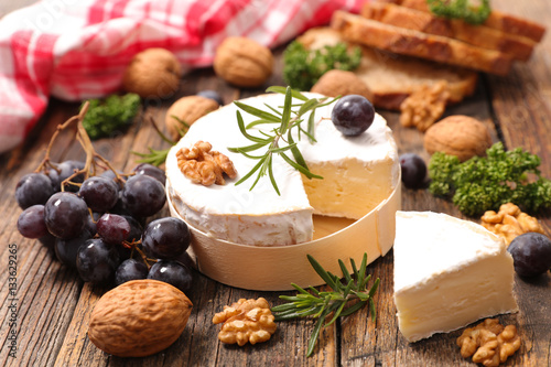 camembert, cheese, grape, walnut, composition, food, gastronomy, ingredient, bread, baguette, rustic, french, dinner, breakfast
