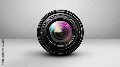 Camera lens with colorful reflections on white background