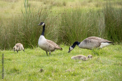 Canada geese with goslings, family, Branta canadensis.