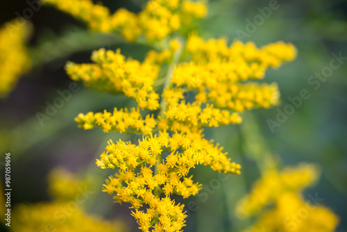 Canada goldenrod, Solidago canadensis yellow flowers closeup selective focus