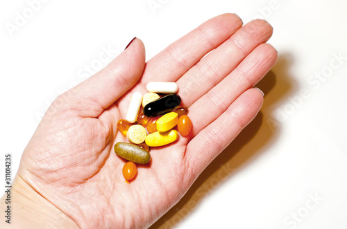 Capsules and tablets of different colors and shapes are a handful in the palm of your hand on a white background. Vitamins, Sports nutrition. Top view, close-up, selective focus.