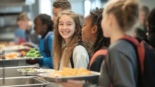Capture students in line at the school cafeteria, excitedly waiting to get their lunch trays
