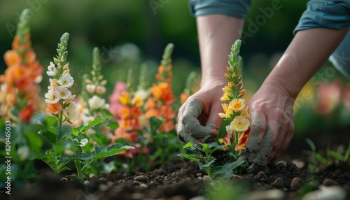 Capture the individual carefully planting, watering, or admiring the flowers