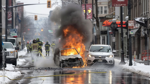 Car burning on city street, malfunction or vandalism, firefighters on scene