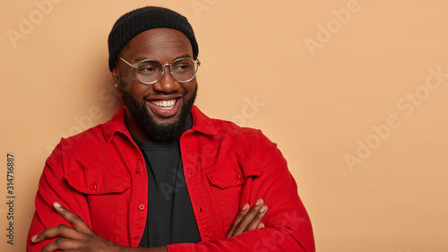 Carefree bearded man has dark skin stands with arms folded, stands self assured, listens good news, looks aside, dressed in fashionable clothing, stands against brown background, copy space area