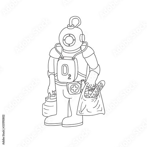 Caricature doodle vector illustration of man in Coronavirus protective antiexposure suite with oxygen mask carrying shopper bag with groceries bottle of water. Pandemics crisis quarantine