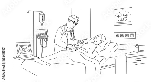 doctor, patient, hospital, medicals, health care, consultation, chart, bed, medicine, disease, recovery, treatment, exam, professional, empathy, care, clinic, health, wellness, diagnosis, check-up, physician, practitioner, disease, disease, bedside, monitoring, equipment, intravenous, drip, monitor, vital, signs, illustration, vector, drawing, outline, line art