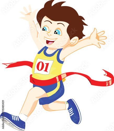 cartoon, boy, race, finish, ribbon, winner, athlete, running, celebration, sport, success, smile, energetic, illustration, track, finish line, red ribbon, track and field