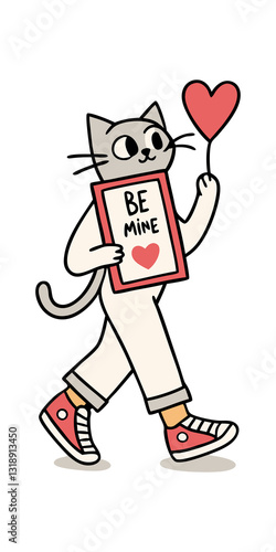 cartoon cat valentine illustration transparent png. anthropomorphic cat with love sign. cute feline holding be mine message.