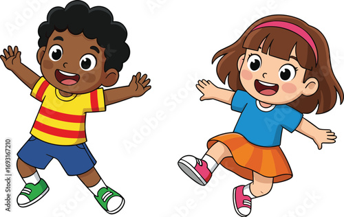 Cartoon, children, jumping, dancing, happy, playful, colorful, fun, movement, joy, illustration, kids, energy, expression, excitement, character, pose, smile, activity, animation
