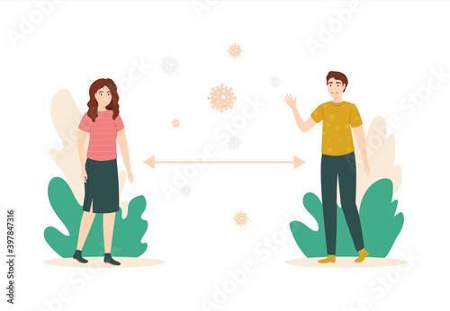 Cartoon Color Characters People and Social Distancing Concept. Vector