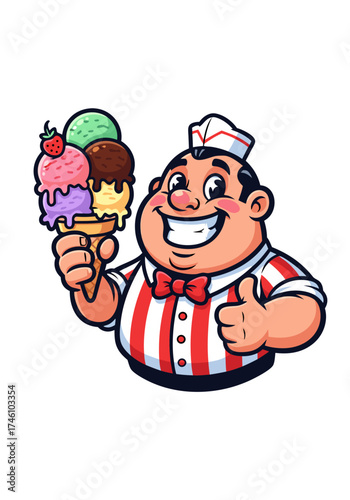 Cartoon illustration of a cheerful ice cream vendor holding a cone with multiple colorful ice cream scoops, wearing a red and white striped shirt, isolated on white