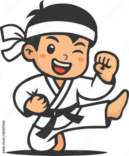 Cartoon martial arts kid kicking, white gi, black belt, headband, energetic pose clipart