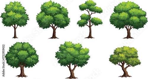 Cartoon tree illustration set, stylized foliage collection, vibrant greenery clipart, outdoor vegetation, forest element, eco concept, garden decoration, seasonal artworkCartoon tree illustration set