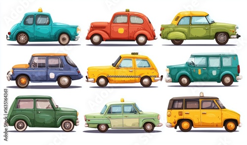 Cartoon vintage taxi fleet. Colorful side profiles of nine retro cars, styled as cartoon illustrations. Vibrant hues and slightly exaggerated features