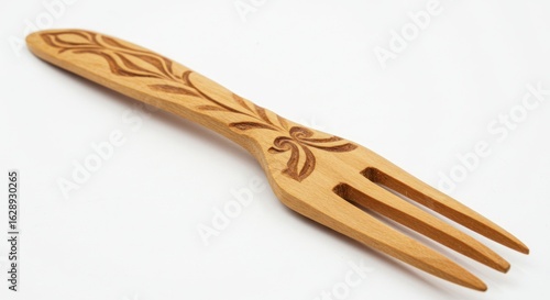 wooden, fork, carved, decorated, design, light, beige, natural, handcraft, craft, rustic, hand-made, utility, utensil, cutlery, kitchen, tableware, food, serving, elegant, simple, ornate, pattern, floral, intricate, wood, carving, tool, object, white, background, close, up, image, product, art, detail, patterned, studio, shot, isolated