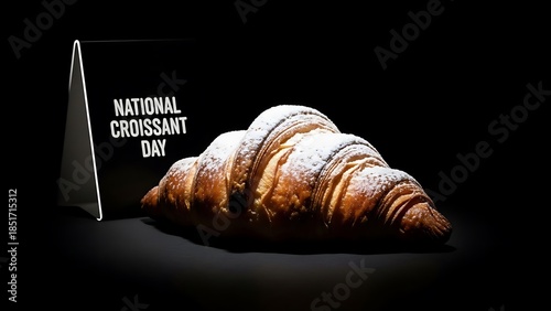 croissant, pastry, baked, flaky, powdered sugar, celebration, national, day, gold, dark, background, delicious, flour, sweet, breakfast, treat, dessert, bakery, morning, snack