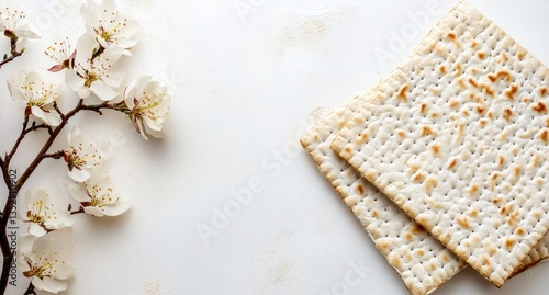 cracker, stack, bread, jewish, holiday, spring, flower, tree branch, blooming, white, background, celebration, food, orthodox, religion, meal, tradition, religious, cultural, topview, studio shot, kosher, unleavened, wheat, table, dining, traditional, copy space, minimal, simplicity, still life, closeup, overhead, eating, snack