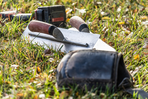 trowel, equipment, tool, construction site, cement, construction, industrial, bucket, steel, medal, abstract, handle, grass, site