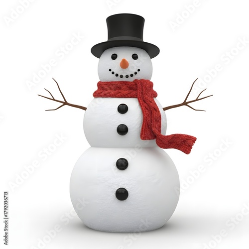 Charming 3D snowman with a top hat and red scarf isolated on a clean white background, symbolizing winter holidays