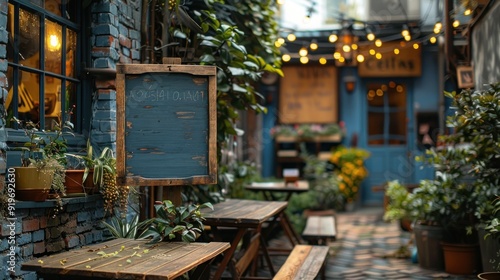 cafes, eatery, patio, table, chair, brick, wall, window, signs, menu, plant, green, leaf, wood, rustic, vintage, cosy, atmosphere, urban, city, street, light, string, light, evening, daytime, warm, colours, natural, lighting, shadow, depth, field, view, sharpened, composition, photo, still, life