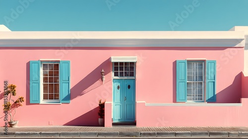 pink, house, blue, shutter, door, architecture, building, facades, exterior, home, residential, property, real estate, window, sky, blue skies, clear, daylight, sunlight, shadow, contrast, vibrant, colourful, bright, cheerful, quaint, charming, traditional, colonial, style, design, colours, hue, paint, wall, structure, urban, suburban, street, sidewalk, foreground, background, minimalist, clean, simple, geometric, pattern, symmetry, asymmetry