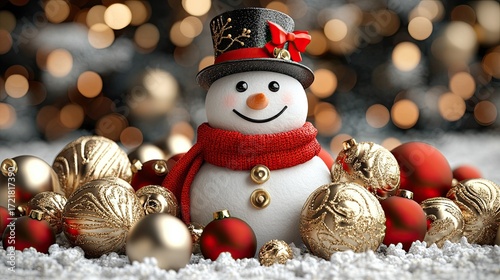 snowman, christmas, holiday, decoration, winter, festive, ornament, red, gold, foulard, smile, cheerful, celebration, merry, background, bokeh, snow, seasonal, joyful, cute, character, toy, accessory, sparkle, joy, warmth, tradition, new year, cosiness, happiness, playful, design, bright, shiny, entity, creative, art, fun, friendly, whimsical, display, nature, setting, gathering, family, occasion, event