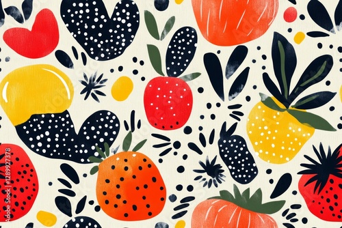 fruit, pattern, illustration, colourful, abstract, leaf, design, whimsical, basis, hand-painted, texture, red, yellow, graphic, orange, decorative, green, elegant, black, geometric, dot, seamless, berry, foliage, structure, background, tile, modern, art, creative, motif, vector, vibrant, repetition, bright, contemporary, textile, trendy, artistic