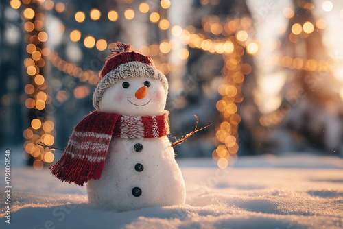 Cheerful snowman in a red knit hat and scarf standing in fresh snow with warm golden bokeh lights — festive cozy winter holiday scene