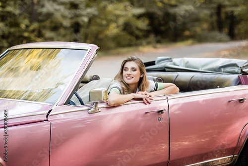 leisure, beautiful, happy, travel, young, smiling, adult, outdoors, cheerful, caucasian, transport, vehicle, style, retro, vintage, to sit, car, road, emotion, stylish, lifestyle, joyful, tour tourism, vacation, journey, attractive, adventure, casual attire, trip, holiday maker, automobile, weekend, daytime, traveler, roadside, cabriolet, cabrio, one person, looking away